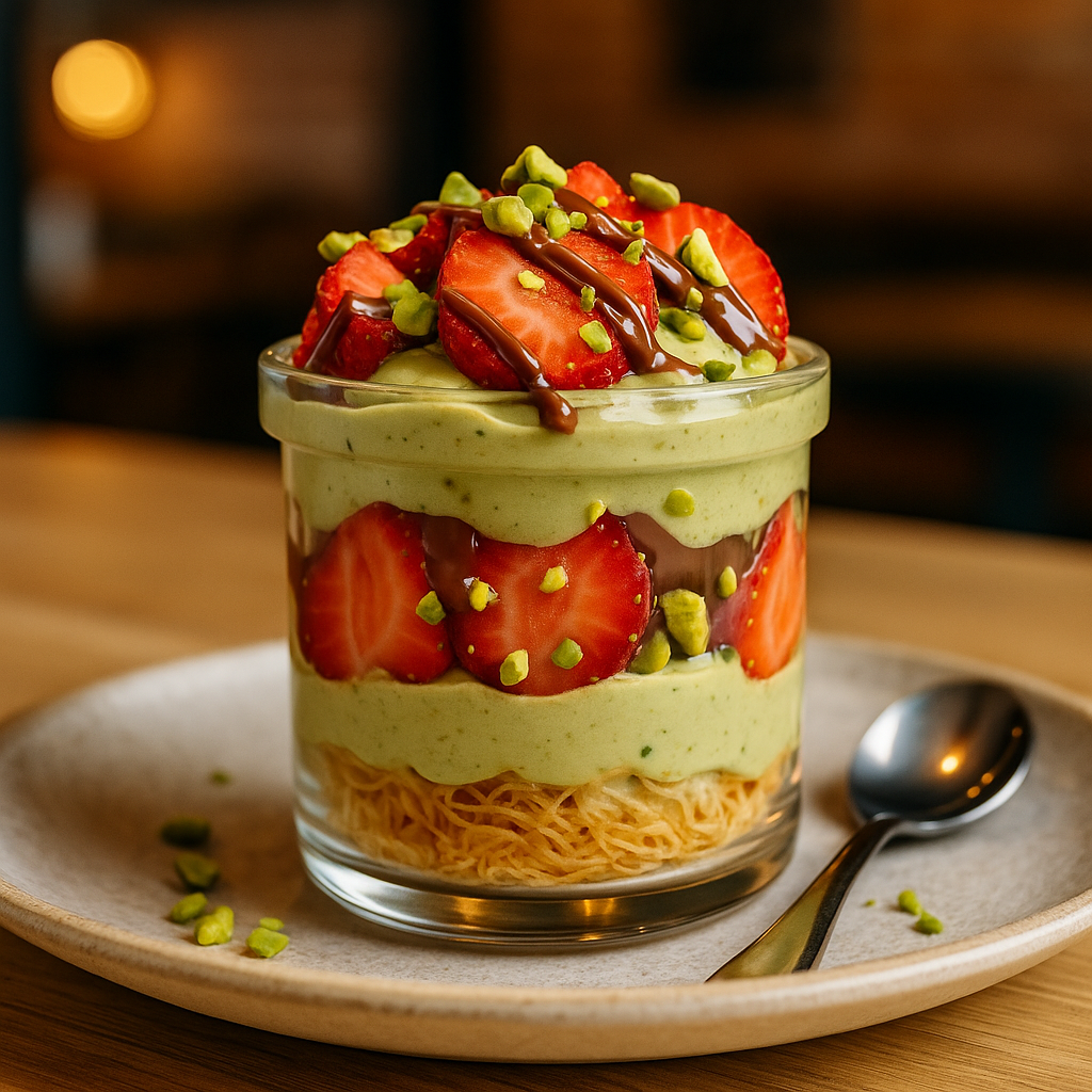 Dessert de Dubaï  fraise, pâte, pistache, chocolat, cheveux d’ange